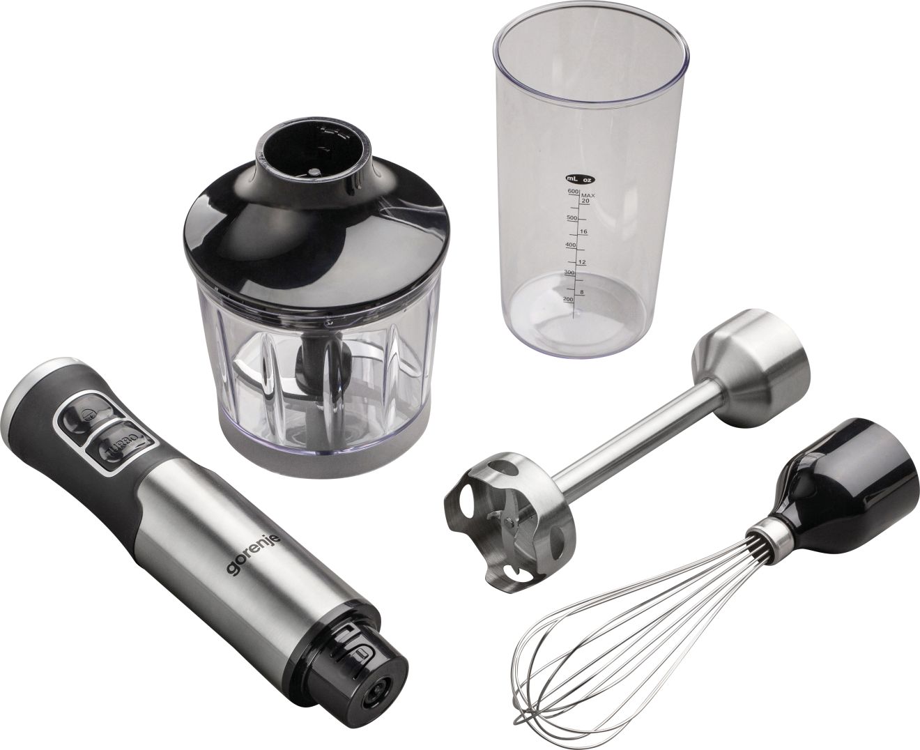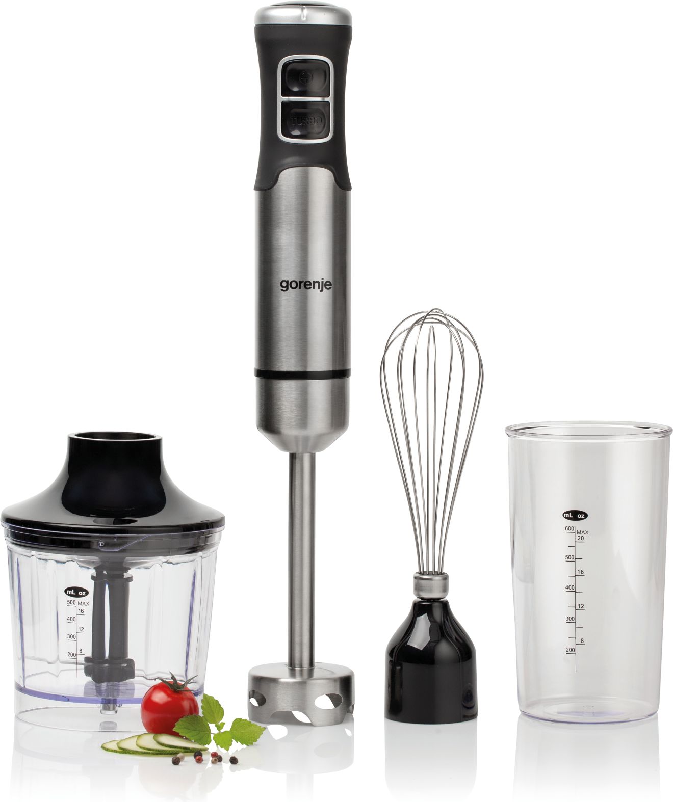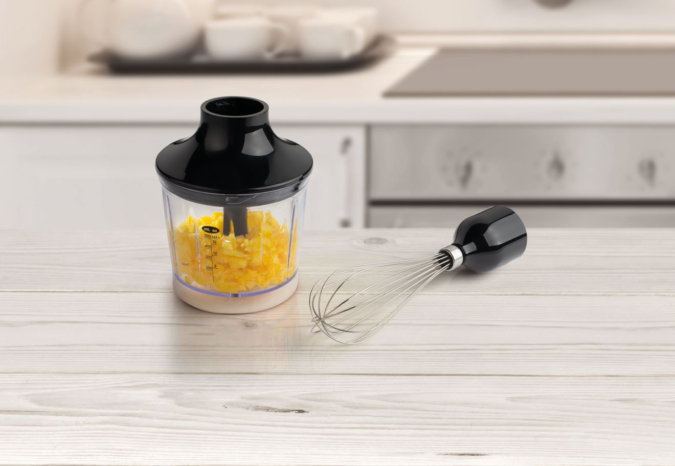 Ovaj model dolazi s bogatom kolekcijom nastavaka. Koristite nogu za sjeckanje od nehrđajućeg čelika kako biste pripremili savršeni pire, umak, smoothie ili juhu. Potreban je samo jedan pokret kako biste pričvrstili metlicu za tučenje kada želite umutiti jaja ili šlag. Sjeckalica s posudom od 500 ml učinkovito će nasjeckati čvršće namirnice u malene komade.
