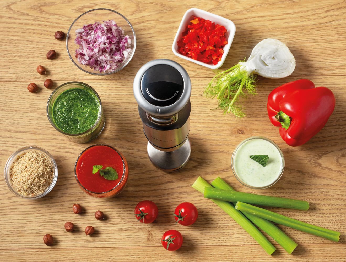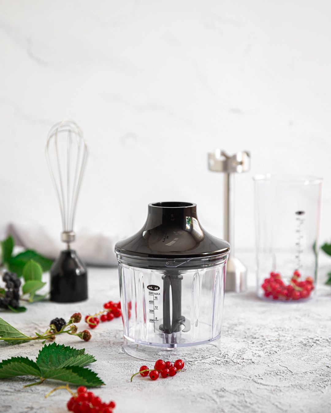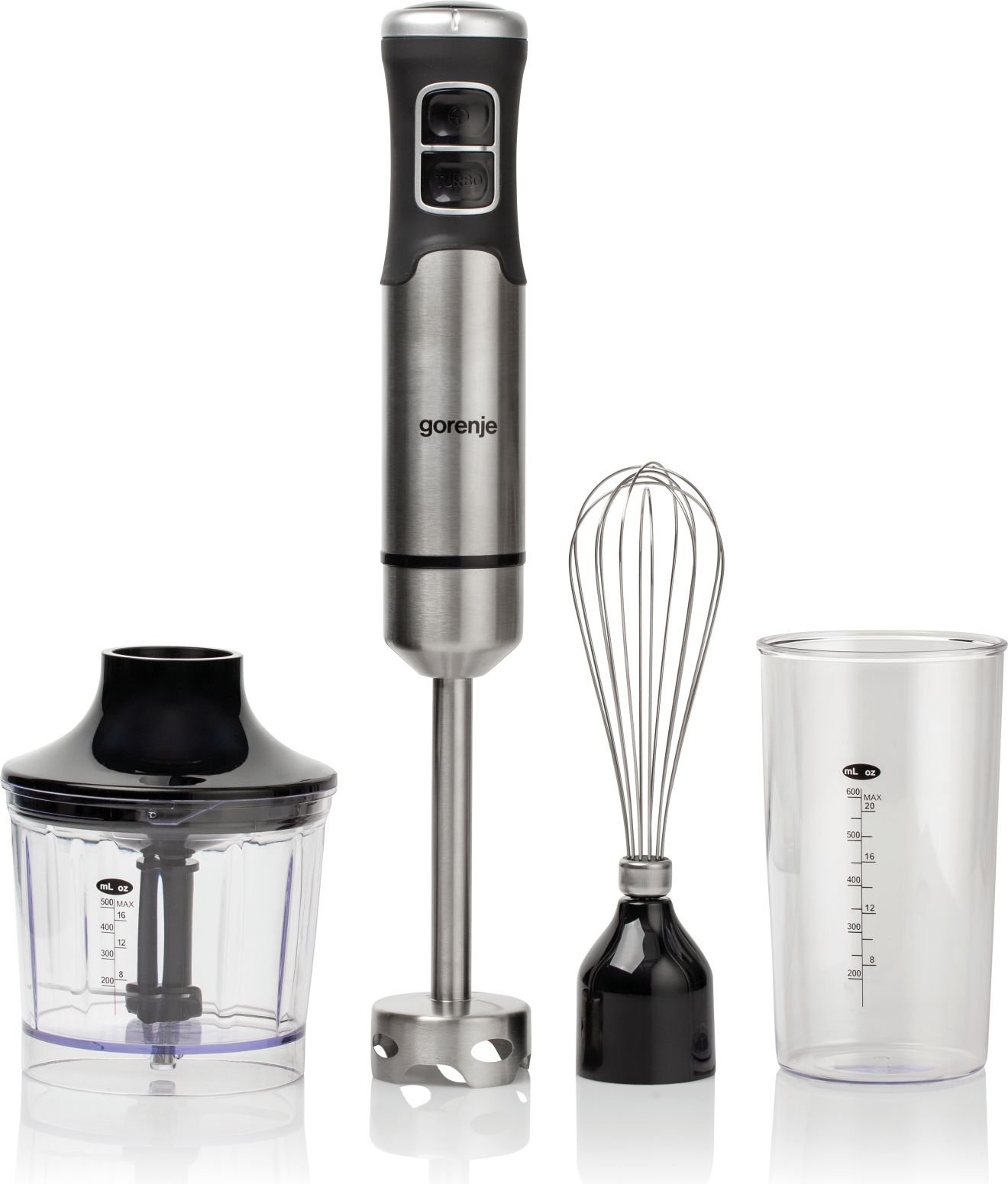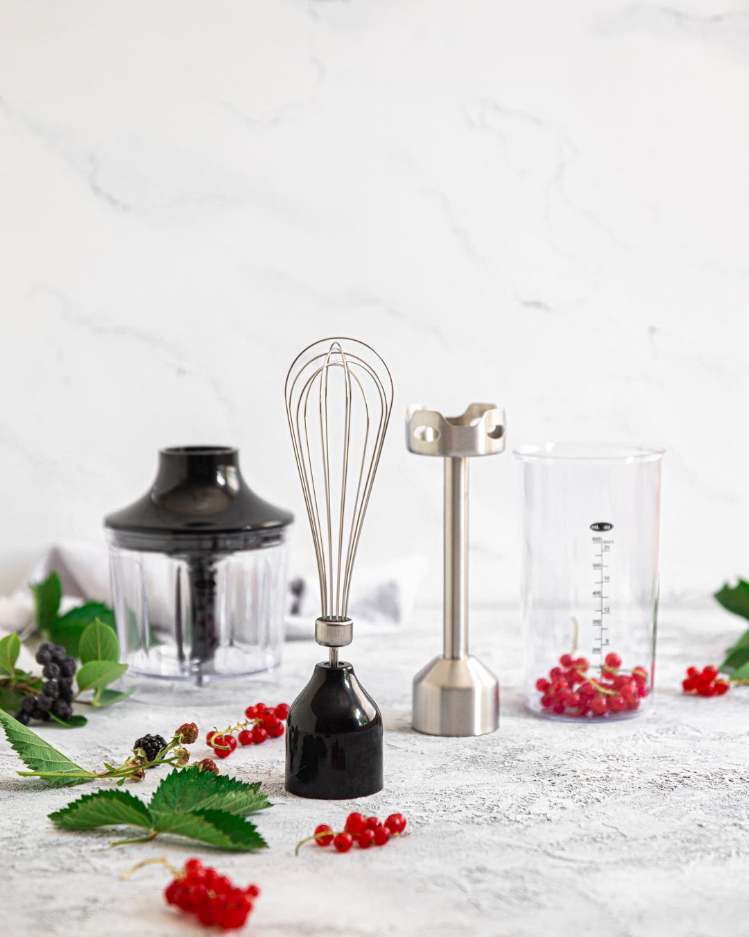 Ovaj model dolazi s bogatom kolekcijom nastavaka. Koristite nogu za sjeckanje od nehrđajućeg čelika kako biste pripremili savršeni pire, umak, smoothie ili juhu. Potreban je samo jedan pokret kako biste pričvrstili metlicu za tučenje kada želite umutiti jaja ili šlag. Sjeckalica s posudom od 500 ml učinkovito će nasjeckati čvršće namirnice u malene komade.