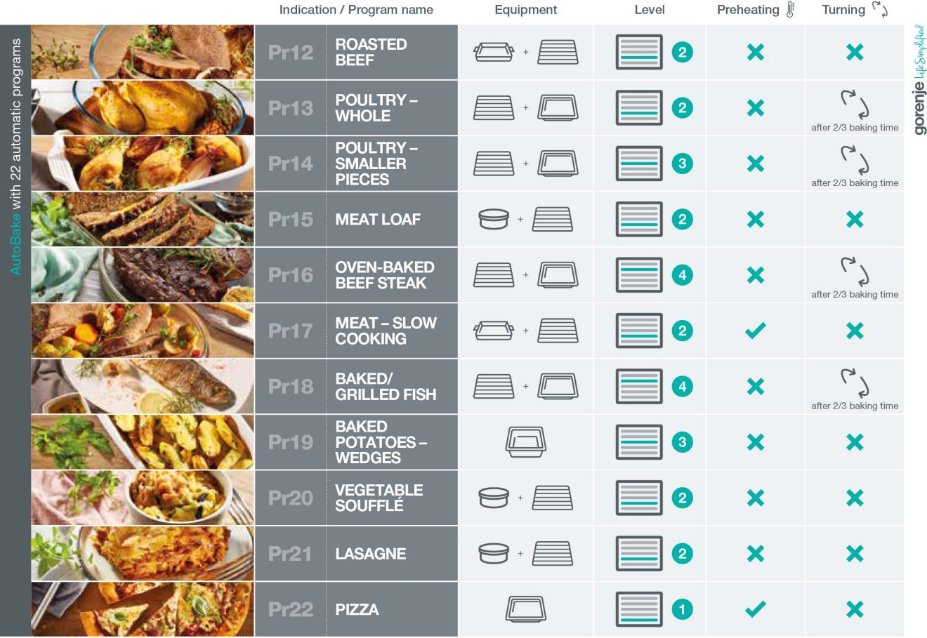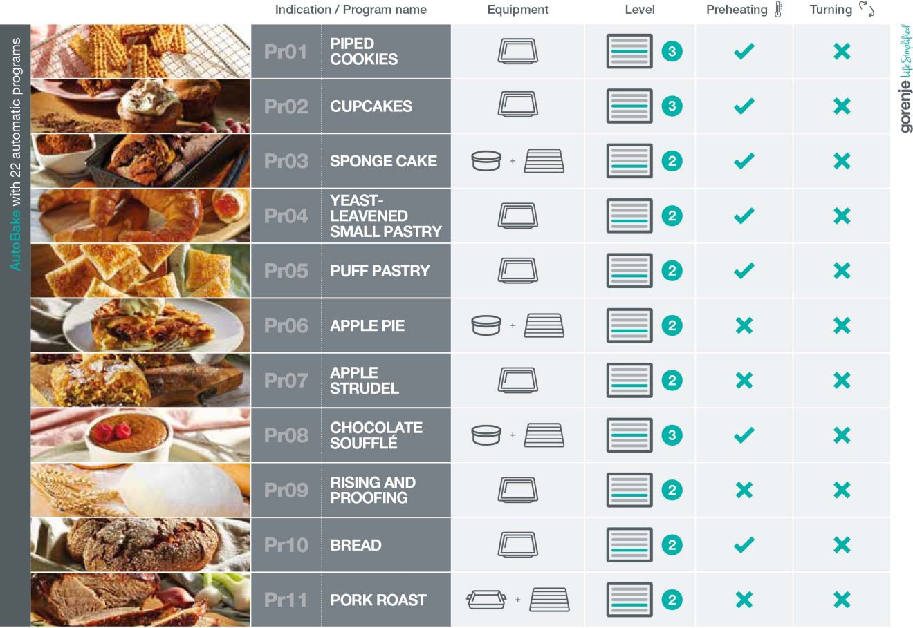 Gorenje OptiBake pećnice donose potpuno automatske programe kuhanja s izborom između 22 najpopularnija recepta, baš savršeno za početnike u kuhinji. Učinkovito testirani od strane Gorenje stručnjaka, AutoBake programi neće vas iznevjeriti te će osigurati odlične rezultate čak i bez prethodnog zagrijavanja pećnice. Sve što korisnik treba napraviti jest odabrati vrstu jela i težinu te pritisnuti Start. Pećnica će učiniti sve ostalo