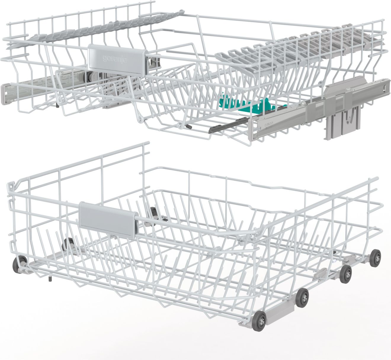 Košare su opremljene označenim pomičnim elementima i prilagodljivim dizajnom košara za jednostavno punjenje. Uistinu jednostavan sustav podešavanja košare na dvije razine omogućuje vam postavljanje čak i najvećih lonaca i tanjura. Stalak za tanjure u donjoj košari može se lako sklopiti. Pribor za jelo može se savršeno organizirati u posebnoj košari, gdje se postavlja odvojeno za savršene rezultate čišćenja i sušenja. Svaki detalj je pažljivo osmišljen za što lakše rukovanje.