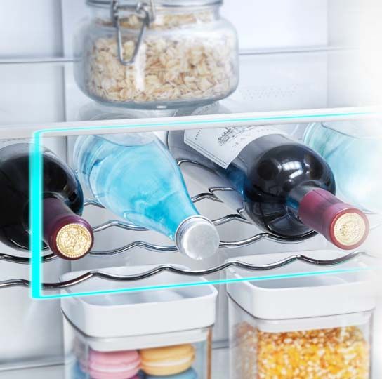 Pomno osmišljen i elegantan prostor za vino i boce pića, koji oslobađa prostor u vratima vašeg hladnjaka i sprječava kotrljanje boca na policama.