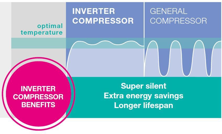Inverterski kompresori su tiši, dugotrajniji i troše manje električne energije u usporedbi s konvencionalnim kompresorom. Brže i bolje se prilagođavaju na temperaturne promjene u hladnjaku, primjerice, kada se otvaraju vrata, što znači da su smanjene fluktuacije u temperaturi i da su uvjeti čuvanja namirnica puno bolji.
