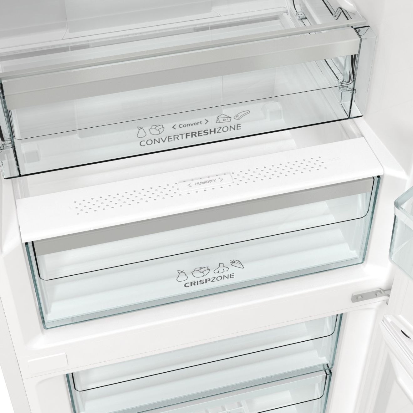Convert FreshZone Ova ladica jednostavno se pretvara iz ladice za ribu i mesu u ladicu za voće i povrće, lako možete pohraniti svoje svježe namirnice na odgovarajući način. IonAir s MultiFlow 360° Napredna tehnologija u Gorenje hladnjacima oponaša prirodni proces ionizacije kako bi osigurala dužu svježinu namirnica. Negativno nabijeni ioni genereirani u hladnjaku kontinuirano osvježavaju zrak imitirajući prirodnu mikroklimu te time stvaraju idealan okoliš za svježu hranu. Ventilacijski sustav MultiFlow 360° ravnomjerno distribuira ionizirani zrak kroz 14 ventilacijskih otvora i održava ravnomjernu temperaturu na svakoj polici hladnjaka. AdaptTech (GardenFresh FS 2020) Ovaj pametni sustav razvijen je kako bi održao optimalnu temperaturu hladnjaka u odnosu na to koliko često otvarate vrata. Kada se vrata otvore, temperatura se trenutno podiže i hrana je izložena termalnom šoku koji dovodi do bržeg propadanja namirnica. Hladnjak konstantno prati i analizira način na koji ga koristite. Na osnovu toga on može predvidjeti kada ćete otvoriti vrata i prije tog trenutka, on će smanjiti temperaturu za 1 ili 2 °C kako bi se pobrinuo da se konstantna temperatura održi i da hrana ostane svježa i puna hranjivih sastojaka. CrispZone s HumidityControl CrispZone je jedna od najvećih ladica za voće i povrće na tržištu. Niska temperatura i mogućnost regulacije vlage osiguravaju dužu svježinu voća i povrća. SlotIn Zahvaljujući funkcionalnosti SlotIn, vrata hladnjaka otvaraju se pod pravim kutom te se sve police i ladice mogu u potpunosti izvući. Ovo rješenje idealno je za one koji hladnjak žele smjestiti u kut uz zid ili u kuhinjsku nišu, između dva aparata ili elementa. LedLight LED svjetlo u hladnjaku omogućava odlično osvjetljenje i dobru preglednost sadržaja hladnjaka. LED osvjetljenje je do 30 puta trajnije od standardnog osvjetljenja i do 10 puta energetski učinkovitije. Držač za boce S praktičnim držačem boca vaše boce i konzerve su jednostavno dostupne i ne zauzimaju prostor tamo gdje možete inače smjestiti druge namirnice. FastFreeze FastFreeze funkcija omogućava zamrzavanje hrane na temperaturi od -24°C kako bi se sačuvalo što više hranjivih tvari u namirnicama. Nakon 48 sati funkcija se automatski isključuje, a prostor zamrzivača vraća se na ranije namještenu temperaturu. EcoMode U slučaju duljeg izbivanja ili godišnjeg odmora, hladnjak je moguće podesiti za rad u EcoMode sustavu, odnosno u sustavu s ekonomičnom potrošnjom električne energije, budući da su vrata hladnjaka stalno zatvorena. Jednostavno čišćenje Zahvaljujući inovativnom dizajnu i sjajnoj glatkoj unutrašnjosti, Gorenje GardenFresh kombinirani hladnjaci izuzetno su jednostavni za čišćenje, čime se osiguralo da namirnice ostanu zdrave i sigurne. SensoTech Switch Velik i pregledan LED zaslon omogućava brzo i lako upravljanje i namještanje temperature. Funkcije poput FastFreeze i HolidayMode mogu se uključiti jednostavnim dodirom. U slučaju iznenadnog povećanja temperature u hladnjaku, ugrađeni alarm odmah će vas upozoriti. E (energetska učinkovitost) Uređaji stari 15 ili više godina troše i do tri puta više energije od uređaja nove generacije. Gorenje novi modeli dolaze s izvrsnom toplinskom izolacijom, uređaji se mogu pohvaliti poboljšanim brtvljenjem vrata, najsuvremenijim komponentama rashladnog sustava i elektronskom regulacijom koja smanjuje korištenje energije na minimum.