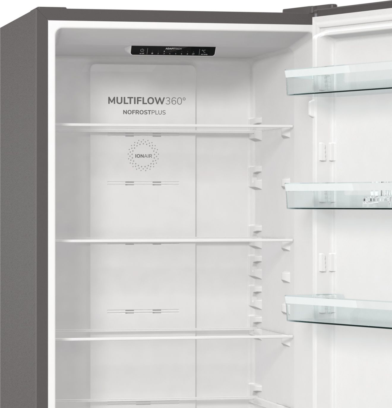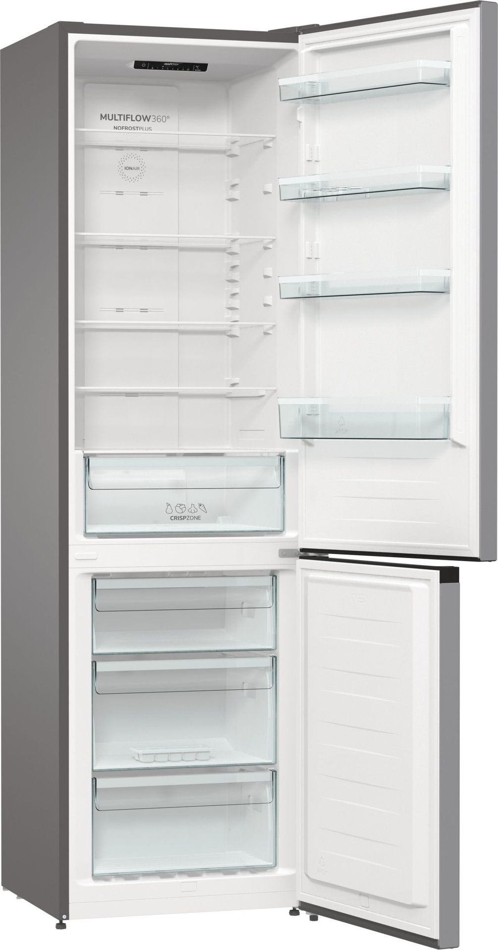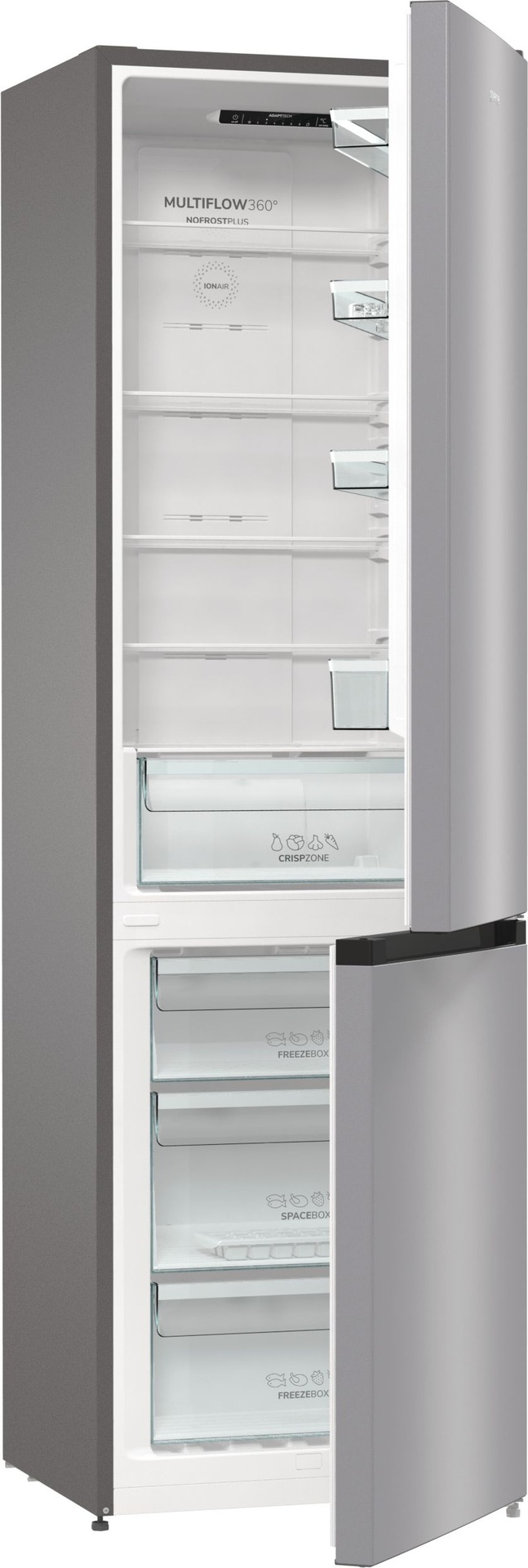 IonAir s MultiFlow 360° Napredna tehnologija u Gorenje hladnjacima oponaša prirodni proces ionizacije kako bi osigurala dužu svježinu namirnica. Negativno nabijeni ioni genereirani u hladnjaku kontinuirano osvježavaju zrak imitirajući prirodnu mikroklimu te time stvaraju idealan okoliš za svježu hranu. Ventilacijski sustav MultiFlow 360° ravnomjerno distribuira ionizirani zrak kroz 14 ventilacijskih otvora i održava ravnomjernu temperaturu na svakoj polici hladnjaka. AdaptTech (GardenFresh FS 2020) Ovaj pametni sustav razvijen je kako bi održao optimalnu temperaturu hladnjaka u odnosu na to koliko često otvarate vrata. Kada se vrata otvore, temperatura se trenutno podiže i hrana je izložena termalnom šoku koji dovodi do bržeg propadanja namirnica. Hladnjak konstantno prati i analizira način na koji ga koristite. Na osnovu toga on može predvidjeti kada ćete otvoriti vrata i prije tog trenutka, on će smanjiti temperaturu za 1 ili 2 °C kako bi se pobrinuo da se konstantna temperatura održi i da hrana ostane svježa i puna hranjivih sastojaka. CrispZone Prostrana ladica CrispZone dizajnirana je da sačuva hranjive sastojke i produži svježinu vaše hrane. Niska temperatura proširuje kvalitetu vašeg proizvoda. Prostrana ladica CrispZone dizajnirana je da sačuva hranjive sastojke i produži svježinu vaše hrane. Niska temperatura proširuje kvalitetu vašeg proizvoda. Prostrana ladica CrispZone dizajnirana je da sačuva hranjive sastojke i produži svježinu vaše hrane. Niska temperatura proširuje kvalitetu vašeg proizvoda. Prostrana ladica CrispZone dizajnirana je da sačuva hranjive sastojke i produži svježinu vaše hrane. Niska temperatura proširuje kvalitetu vašeg proizvoda. Prostrana ladica CrispZone dizajnirana je da sačuva hranjive sastojke i produži svježinu vaše hrane. Niska temperatura proširuje kvalitetu vašeg proizvoda. Prostrana ladica CrispZone dizajnirana je da sačuva hranjive sastojke i produži svježinu vaše hrane. Niska temperatura proširuje kvalitetu vašeg proizvoda. Prostrana ladica CrispZone dizajnirana je da sačuva hranjive sastojke i produži svježinu vaše hrane. Niska temperatura proširuje kvalitetu vašeg proizvoda. CrispZone je jedna od najvećih ladica za voće i povrće na tržištu, osmišljena da zadrži hranjive tvari i niskom temperaturom produlji svježinu vaše hrane. SlotIn Zahvaljujući funkcionalnosti SlotIn, vrata hladnjaka otvaraju se pod pravim kutom te se sve police i ladice mogu u potpunosti izvući. Ovo rješenje idealno je za one koji hladnjak žele smjestiti u kut uz zid ili u kuhinjsku nišu, između dva aparata ili elementa. LedLight LED svjetlo u hladnjaku omogućava odlično osvjetljenje i dobru preglednost sadržaja hladnjaka. LED osvjetljenje je do 30 puta trajnije od standardnog osvjetljenja i do 10 puta energetski učinkovitije. FastFreeze FastFreeze funkcija omogućava zamrzavanje hrane na temperaturi od -24°C kako bi se sačuvalo što više hranjivih tvari u namirnicama. Nakon 48 sati funkcija se automatski isključuje, a prostor zamrzivača vraća se na ranije namještenu temperaturu. EcoMode U slučaju duljeg izbivanja ili godišnjeg odmora, hladnjak je moguće podesiti za rad u EcoMode sustavu, odnosno u sustavu s ekonomičnom potrošnjom električne energije, budući da su vrata hladnjaka stalno zatvorena. Jednostavno čišćenje Zahvaljujući inovativnom dizajnu i sjajnoj glatkoj unutrašnjosti, Gorenje GardenFresh kombinirani hladnjaci izuzetno su jednostavni za čišćenje, čime se osiguralo da namirnice ostanu zdrave i sigurne. E (energetska učinkovitost) Uređaji stari 15 ili više godina troše i do tri puta više energije od uređaja nove generacije. Gorenje novi modeli dolaze s izvrsnom toplinskom izolacijom, uređaji se mogu pohvaliti poboljšanim brtvljenjem vrata, najsuvremenijim komponentama rashladnog sustava i elektronskom regulacijom koja smanjuje korištenje energije na minimum.