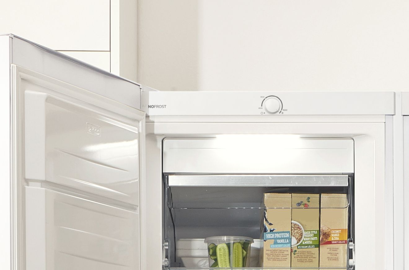 Intenzivna cirkulacija hladnog zraka uklanja vlagu iz uspravnog zamrzivača. To sprječava nakupljanje inja na hrani i leda na unutarnjim zidovima i održava nisku potrošnju energije. Kao rezultat toga, iskorištenost skladišnog kapaciteta je optimalna, a odmrzavanje i čišćenje unutrašnjosti više nisu potrebni. Paketi ili komadi smrznute hrane neće se lijepiti jedni za druge, pa će vaša hrana u zamrzivaču biti čista i uredna.