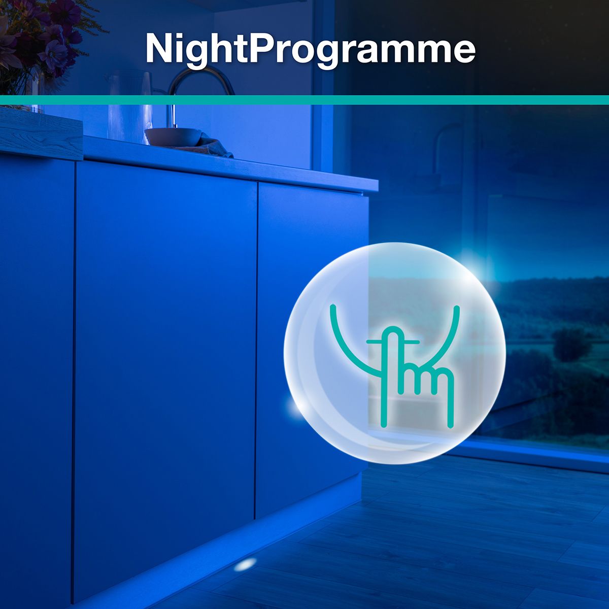 S noćnim programom nova perilica posuđa Gorenje je 2 dB manje bučna od standardnog programa. Posuđe će vam ujutro biti čisto, a san neometan.