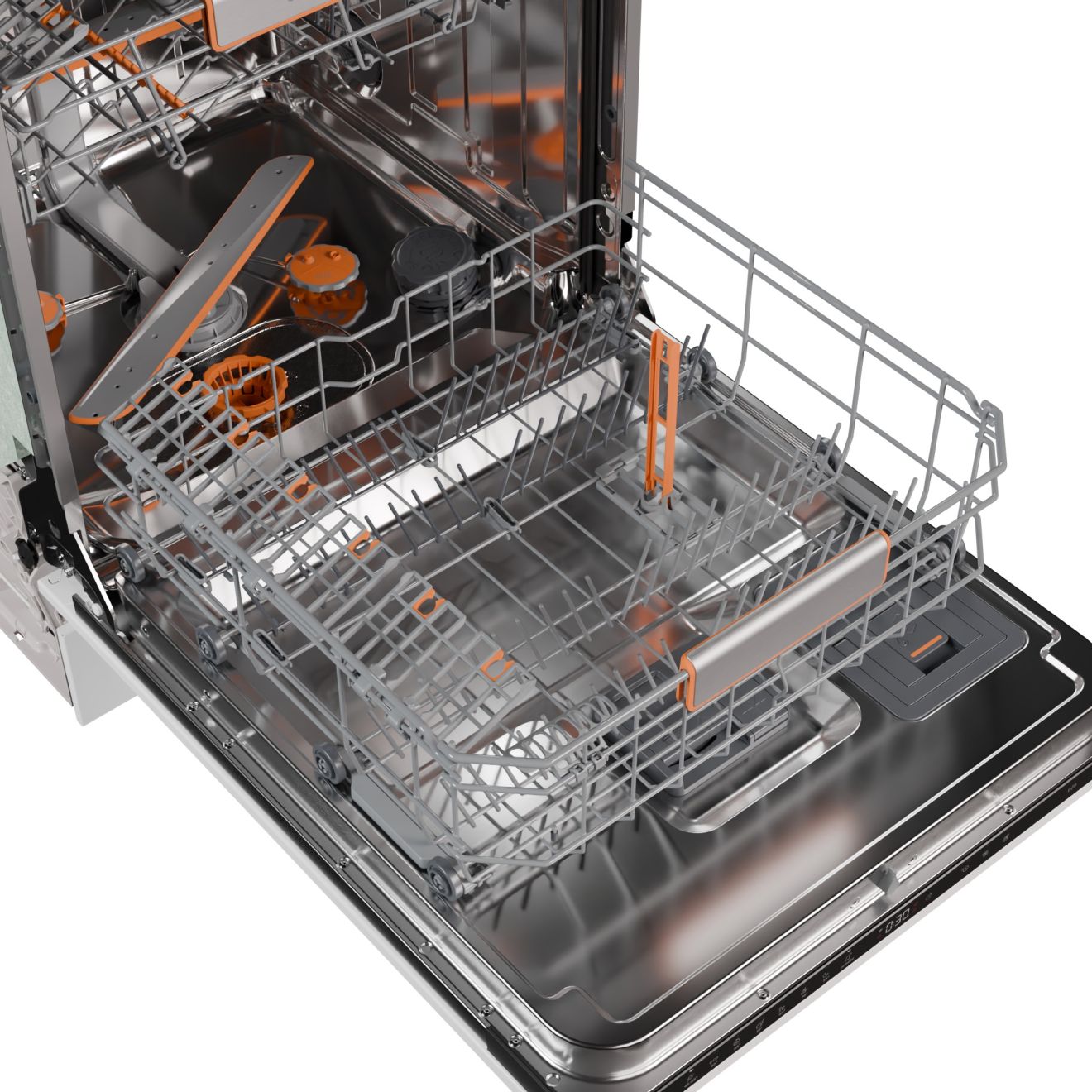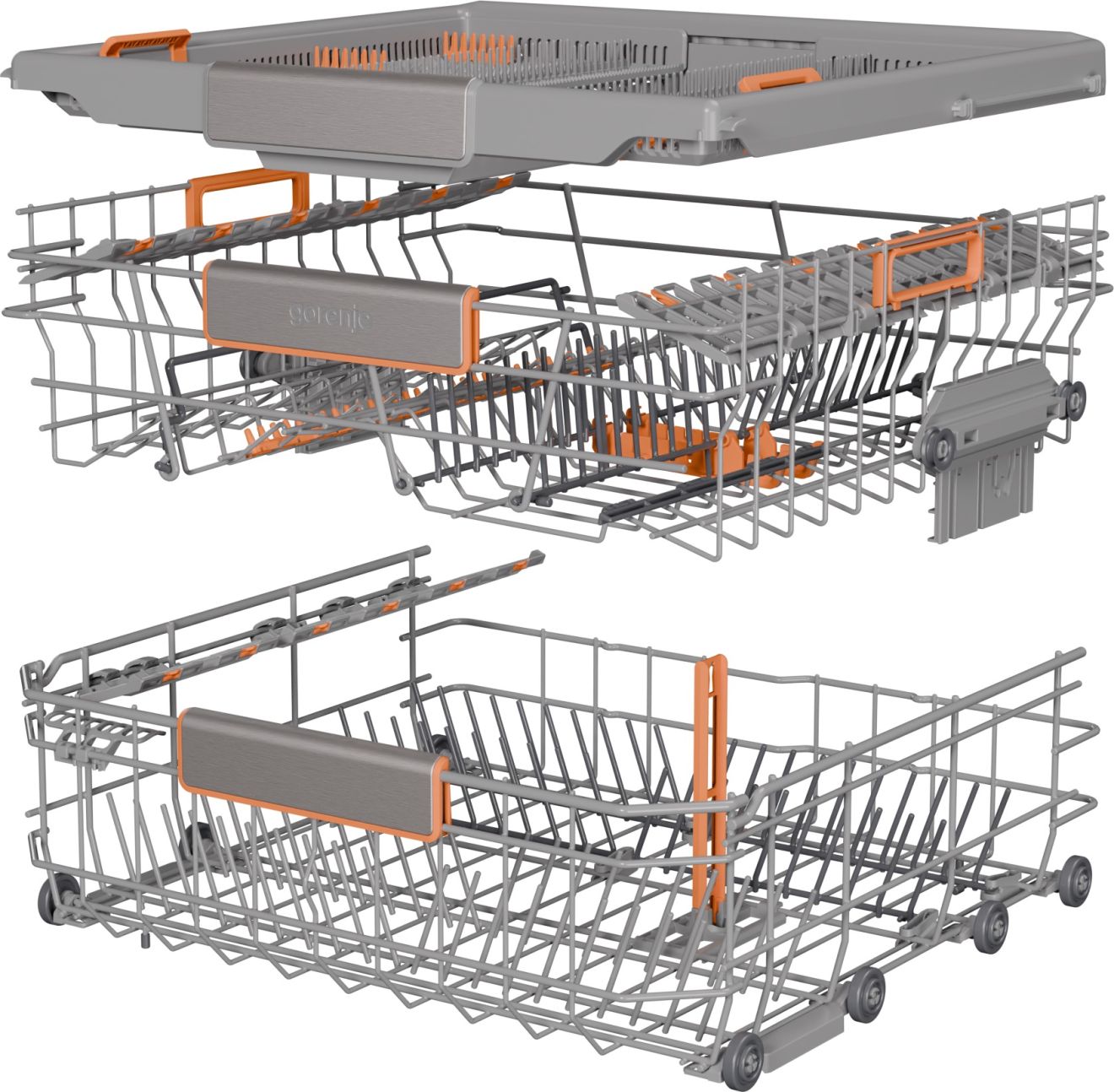 Košare su opremljene označenim pomičnim elementima i prilagodljivim dizajnom košara za jednostavno punjenje. Uistinu jednostavan sustav podešavanja košare na dvije razine omogućuje vam postavljanje čak i najvećih lonaca i tanjura. Stalak za tanjure u donjoj košari može se lako sklopiti. Pribor za jelo može se savršeno organizirati u posebnoj košari, gdje se postavlja odvojeno za savršene rezultate čišćenja i sušenja. Svaki detalj je pažljivo osmišljen za što lakše rukovanje.